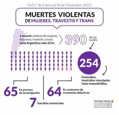 El informe del Registro Nacional de Femicidios, Femicidios Vinculados, Trans/Travesticidios y otras muertes violentas del Observatorio Nacional MuMaLa correspondiente al año 2023 se cerró ... -