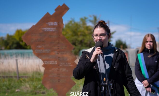 (Agencia Andar) Las profesoras y sus alumnos se sienten realizados luego de concretar su proyecto. En el marco del programa Jóvenes y Memoria el martes 24 inauguraron un monumento con los nombres de los desaparecidos de la localidad de Coronel Suárez. “Hoy algunos sectores relativizan lo que pasó, no es por ignorancia, eso es peligroso porque cuando se borra la memoria se habilita a que se repita. La memoria no es pasado para defender el presente”, dijo Donna Rossetti, una de las estudiantes que participó del proyecto en 2023. Sobre el verde césped al costado de las vías, también estuvieron Ignacio Funes Haidt y Benjamín Loustaneu, actuales alumnos de la escuela secundaria 4 de esa localidad. El concejal Miguel Desch felicitó a los protagonistas y a sus maestras por los 20 años del programa Jóvenes y Memoria.