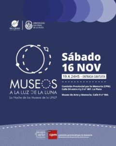 (Agencia Andar) Son 49 museos y 11 circuitos los que integran la propuesta de esta edición Museos a la luz de la luna, una invitación a recorre el patrimonio cultural de la región a través de sus museos que coordina la Red de museos de la UNLP. La CPM participará de dos de los recorridos que se proponen desde la organización: en el circuito 5 con actividades en su sede – ex sede de la Dirección de inteligencia de la Policía de la Provincia de Buenos Aires, ubicada en 54 N° 487 entre 4 y 5, y en el circuito 8 con su Museo de Arte y memoria en 9 N° 984 entre 51 y 53.