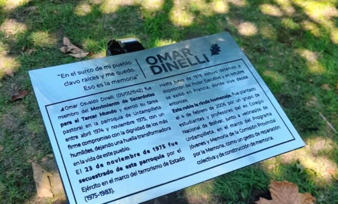 (Agencia) En el marco de las actividades por los 50 años del golpe de Estado que dio inicio a la última dictadura cívico-militar y eclesiástica, repusieron la placa recordatoria del sacerdote Omar Dinelli, víctima del terrorismo de Estado en la localidad de Urdampilleta, partido de Bolívar. Su caso fue investigado por estudiantes de esa localidad como parte del programa Jóvenes y Memoria de la CPM, y resultó prueba en el juicio oral que comenzó en 2022. “Era un cura que se caracterizaba por una gran aceptación de la comunidad, su parroquia siempre estaba llena de creyentes y no creyentes, todos acudían por su carisma”, dijo a ANDAR Jorge Salduondo, profesor de Comunicación y educación y campo de la práctica docente en la UNICEN y en ISFD 27 de Bolívar.