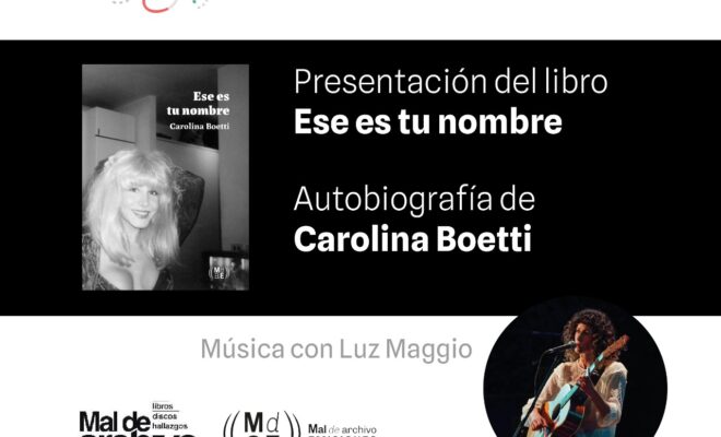 Carolina Boetti, la primera mujer trans de Argentina que recibió el reconocimiento de una pensión reparativa por haber sido una presa política durante la última dictadura, presenta su autobiografía este 29 de noviembre a las 18 hs en el auditorio de la Comisión Provincial por la Memoria (54 #487). Acompañará con su música y poesía la artista Luz Maggio.