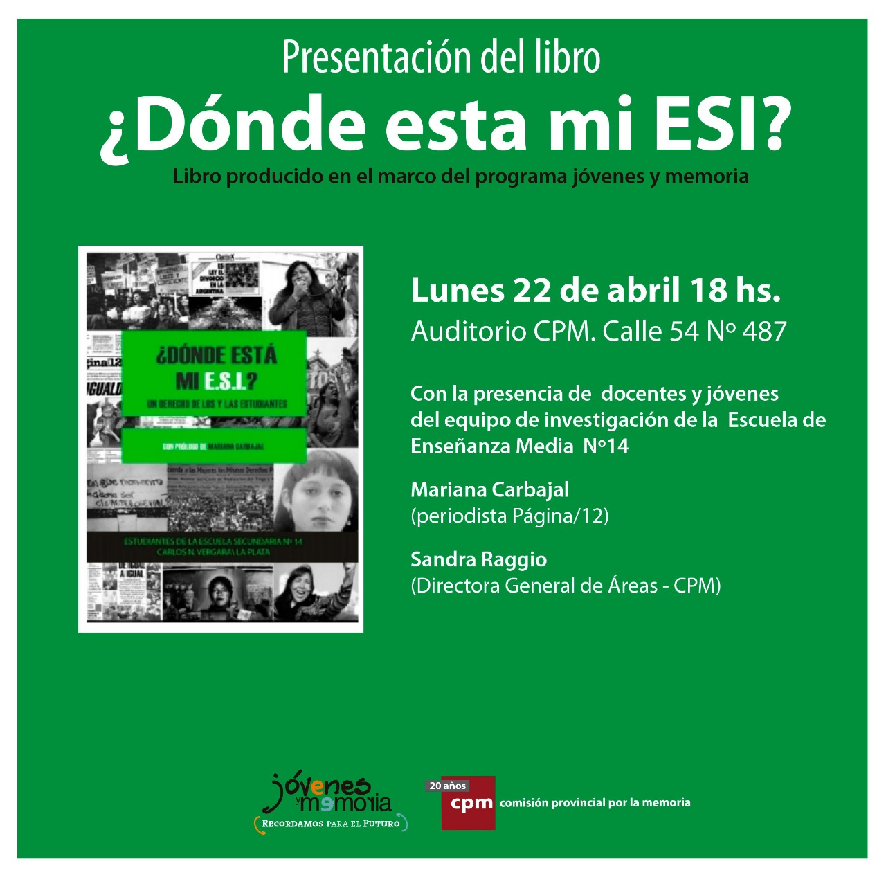 Estudiantes y docentes de la Escuela Secundaria 14 Carlos Vergara de La Plata presentaron su libro ¿Dónde está mi ESI?, un manual sobre salud sexual integral producido en el marco del programa Jóvenes y Memoria. La actividad se llevaró a cabo en la Comisión Provincial por la Memoria y contó con la participación de la periodista Mariana Carbajal, quien escribió el prólogo del libro, y la directora general de Áreas de la CPM, Sandra Raggio.