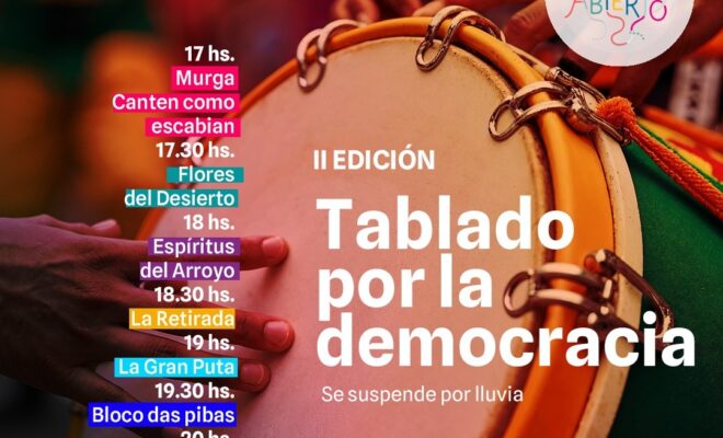 El próximo sábado 28 de marzo a partir de las 17 hs. llega la segunda edición de Tablado por la democracia, la propuesta cultural que abre la agenda de sábados abiertos de la CPM y retoma el espíritu de resistencia, creatividad, denuncia y memoria de los carnavales para celebrar la democracia. Se desarrollará en la calle, frente a la Casa de la CPM en 54 (4 y 5) #487 desde las 17 hs. con diversas murgas de la ciudad de La Plata y Rosario. La actividad es gratuita y se suspende por lluvia.