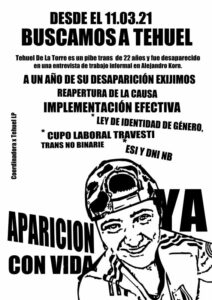 (Agencia) “A Tehuel lo desaparecieron hace un año, en una entrevista de trabajo informal. Vamos a seguir gritando, porque justicia es que no nos desaparezcan. Queremos a Tehuel vivo y ya. Queremos amucharnos para saber que estamos” dicen en la convocatoria. A quienes piden justicia les preocupa que el cambio de carátula cierra el caso y termina la búsqueda. “ESA, no es una posibilidad. Seguimos gritando que Tehuel no está, y que tiene que aparecer con vida. Que hay que buscarlo, que el Estado es responsable, pero eso no nos inmoviliza. Nos estamos organizando”, dicen.