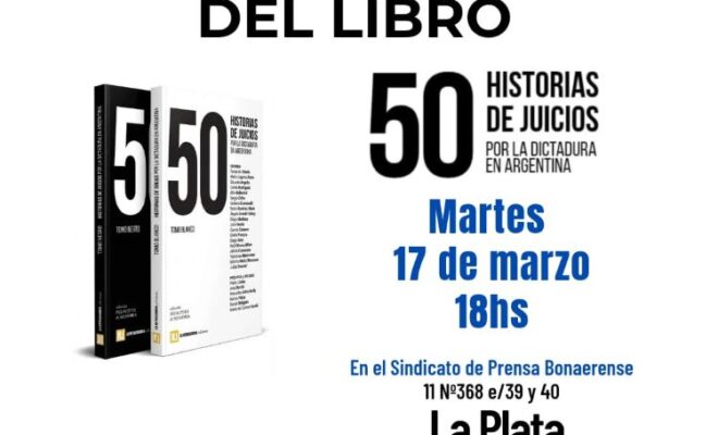 Este martes 17 de marzo a las 18:00hs en el Sindicato de Prensa Bonaerense (SiPreBo, calle 11 entre 39 y 40, La Plata) se presenta 50 Historias de juicios por la dictadura en Argentina, un libro que reúne crónicas de juicios por crímenes de lesa humanidad a través de la cobertura realizada a través del medio comunitario, alternativo y popular La Retaguardia.