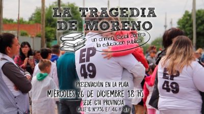 Este miércoles 26 de diciembre a las 18 horas se presentará “La tragedia de Moreno: un crimen social contra la escuela pública”. Será en la ... -