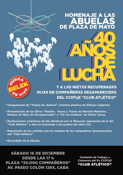 Este sábado 16, a las 17 hs, la Comisión de Trabajo y Consenso del Ex CCDTyE “Club Atlético” realizará un homenaje que a las ... -