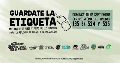 El encuentro “Guardate la etiqueta” es el 3er encuentro que organiza la Coordinadora de niñeces, juventudes y territorios en la región de La Plata. Será ... -